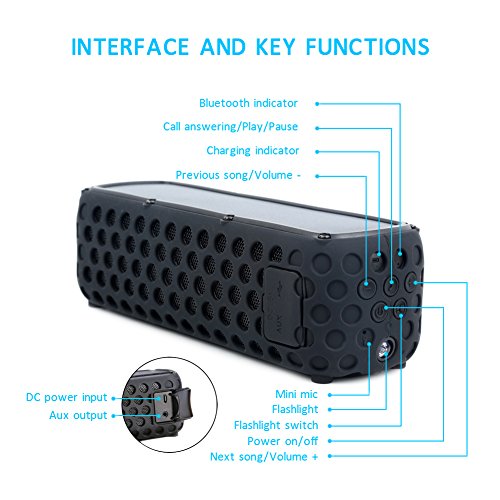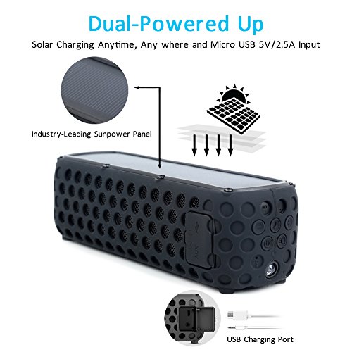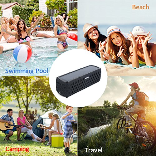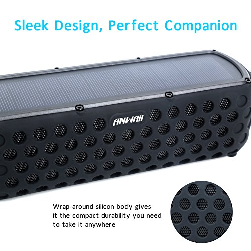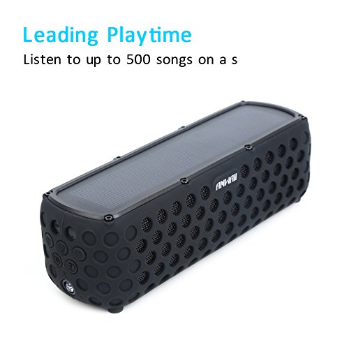 IPX5 Splashproof, Shockproof, Dust-proof - With its unique rugged spare design and IPX5 rating (not submersible,but can withstand accidental drop in water), Anwaii solar bluetooth speaker is Splash-poof & Shockproof & Dust-proof, can stay safe in many types of indoor and outdoor condition, in shower, rain, pool or on a boat