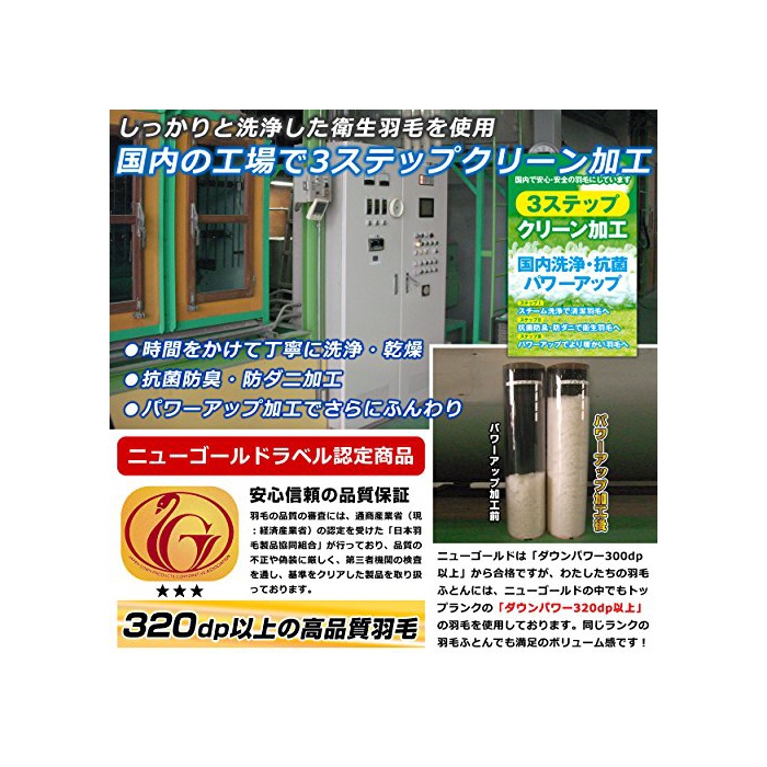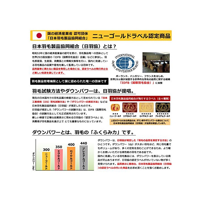 「일본 깃털 제품 협동조합」의 인정을 받은 고품질의 뉴 골드 라벨 깃털 이불입니다.뉴 골드의 인정 기준은「다운 파워300dp」의 깃털이지만,이 상품은 그것을 크게 클리어한 320dp의 톱 랭크 깃털을 사용 하고 있습니다. 「일(날) 마리협」란,통상산업부(현:경제 산업성)의 인가를 취득한 정식인 단체로,정확한 품질 표시나 산지 등,엄격하게 관리를 행하고 있는 단체입니다.안심하고 상품을 바라 하실 수 있습니다.