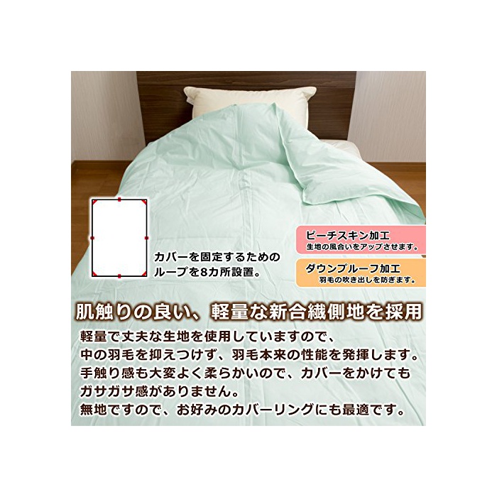 사용 하고 있는 깃털은「국내 세정 항균 파워 업 가공」를 세운 청결 깃털에 하고 있습니다. 견실 한 위생 가공으로,보다 안심하고,보다 쾌적하게 이용 받는입니다. 원단도,촉감과 튼튼함을 중시하고, 매우 촉감이 좋은 경량 원단을 채용했습니다. 커버를 고정하기 위한 룹도 8개소 설치 하고 있습니다. 세척으로도 대응에서 가정에 간단하게 손질을 할 수 있습니다.