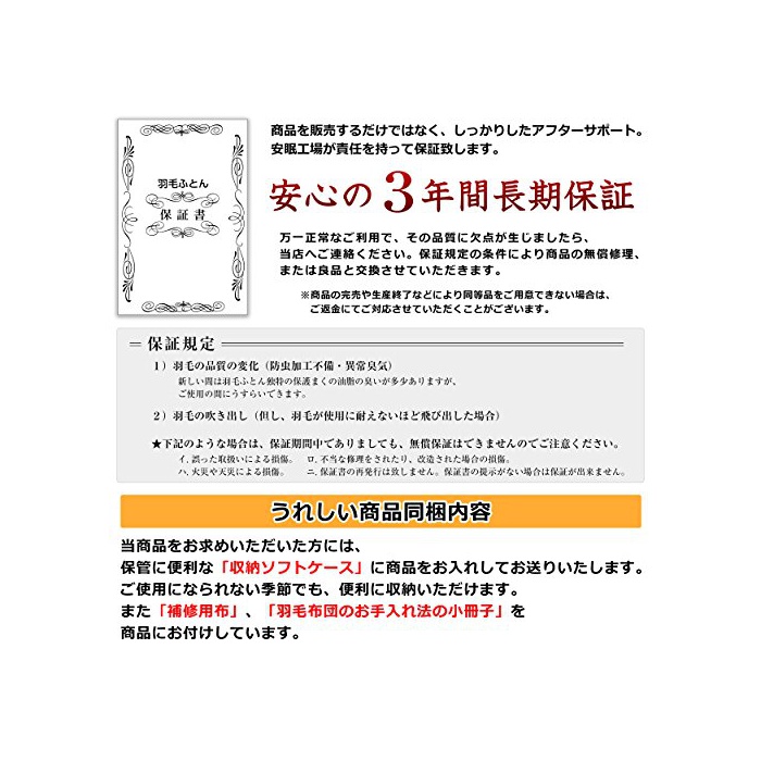 국내 세정과 파워 업 가공 후에 깃털을 건조시키지만,너무나 고온으로 건조하면 깃털이 아프게 끝 내구성이 손상되는 모아 두고, 당점에서는 수분이 증발하는 100℃전다음에 시간을 들여 제대로 건조 시키고 있습니다.그 때문에,매우 부풀어 오르가 있는 친절한 깃털에 마무리되고, 보다 길게 쾌적하게 사용하실 수 있는 깃털 이불이 되고 있습니다.수고가가 걸렸 진짜 깃털 이불을 즐겨주십시오.