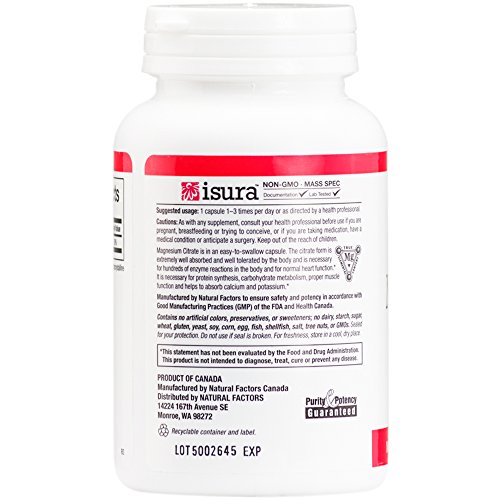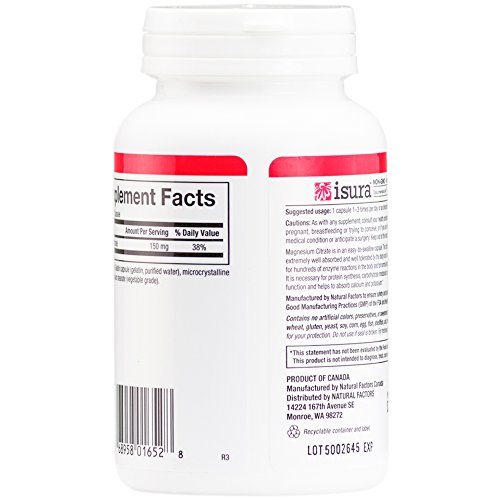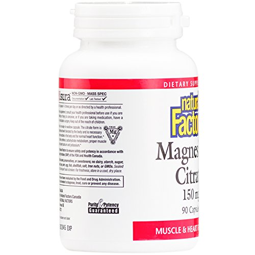 Studio : Natural Factors Publisher : Natural Factors Binding : Health and Beauty Product Description Natural Factors Magnesium Citrate capsules contain 150mg of this extraordinary mineral. Magnesium is necessary for hundreds of enzyme reactions in the body and for normal heart function. It is necessary for protein synthesis, carbohydrate metabolism, proper muscle function and helps to absorb calcium and potassium. Citrates are extremely well absorbed and well-tolerated by the body making Natural Factors Magnesium Citrate capsules an excellent way to get this important mineral.;Contains no artificial preservatives, color, dairy, sweeteners, starch, wheat or yeast. 0