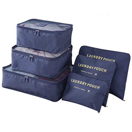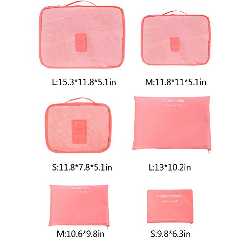 Detailed Description: Large packing cubes are suitable for large clothing or blankets, such as coats, jackets, cotton padded clothes, etc. Medium packing cubes are suitable for shirts, T-Shirts, trousers, skirts and other spring and autumn clothes. Small packing cubes suitable for: short sleeve, shorts, underwear and other small items, shoes can also be put. Large pouches are suitable for: lingerie, bras, books, etc. Medium pouches are suitable for: towels, cosmetics, socks, etc. Small pouches are suitable for: documents, toiletries, drugs and other small objects.