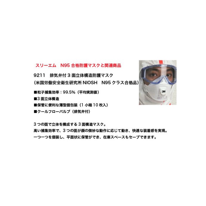 원본상품명:防護マスク 3M 9211 N95 排?弁付 【10枚入】 3面立?構造防護マスク