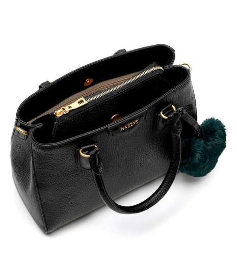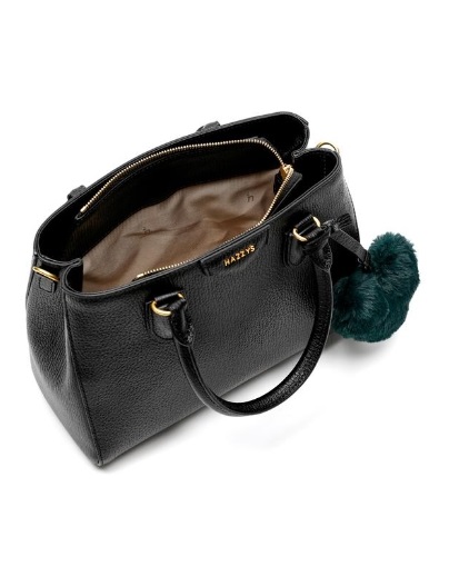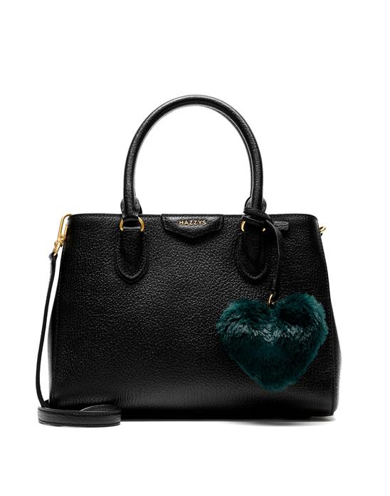 블랙 컬러 바탕에 베이직한 디자인으로 그린 하트퍼 장식과 HAZZYS 골드 로고로 포인트를 준 크로스백 겸용 토트백 입니다.