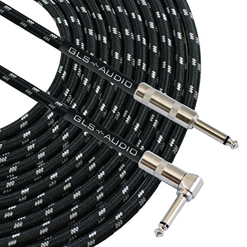 GLS Audio 20 Foot Guitar Instrument Cable - Right Angle 1/4-Inch TS to Straight 1/4-Inch TS 20 FT Black Gray Tweed Cloth Jacket - 20 Feet Pro Cord 20' Phono 6.3mm - SINGLE