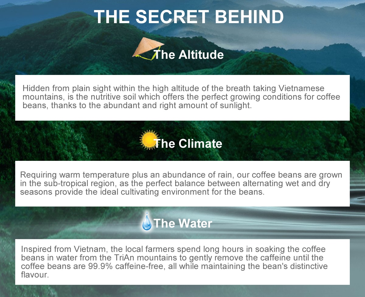The secret is the water. The long hours of soaking the coffee beans results in a caffeine-free coffee (de-caf), without compromising the rich taste.