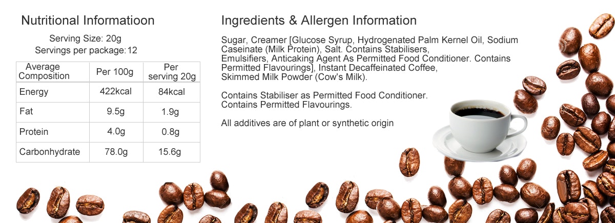 Gula, Krimer [Sirap Glukosa, Minyak Isirung Kelapa Sawit Terhidrogen, Natrium Kaseinat (Protein Susu), Garam. Mengandungi Penstabil, dan Agen Antipengerakan Sebagai Kondisioner Makanan Yang Dibenarkan. Mengandungi Perisa Yang Dibenarkan.], Kopi Segera Tanpa Kafeina, Susu Tepung Skim (Susu Lembu).