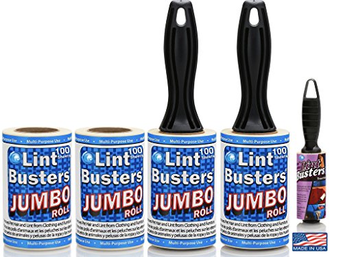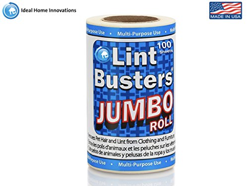 Simplify your morning routine or afternoon cleaning with the power of the 100-sheet Jumbo lint roller. Extra-sticky sheets are designed to keep your clothes and furniture free of hair, lint, and dust. There's nothing worse than discovering that your perfectly planned outfit is covered in pet hair or dryer lint. Luckily, the Jumbo lint roller pack has you covered. As an instant solution to lint or fur on any surface, these extra-sticky rollers come with 100 heavy-duty sheets that trap fuzz, then tear away easily. Each bulk pack comes with a bonus travel roller so you can quickly lift away dander or lint, keeping you prepared at work or on the go. *Quickly remove pet hair from clothes and upholstered furniture. *Thick adhesive sheets are perforated for easy tear-away. *100-sheet jumbo rolls prolong the life of each roller. *Bonus mini roller fits compactly in your bag, desk, or car. *Handle fits all Lint Buster rolls with internal diameter of 1.5 inches. *Each sheet measures 4.0 x 7.5 inches. *Made in the USA. THE PET OWNER'S SECRET WEAPON Most pets shed year-round with increased output in the spring and fall, which means your furry friend probably isn't the only thing that's furry in your household. *Clean couches, chairs, throw pillows, and decorative linens. *Avoid time-intensive wash cycles, ineffective wiping, and costly steaming units. *Keep up appearances before a big meeting, first date, or busy day. *Maintain your clothing retail stock or personal closet. *Defend your black clothing from fur, dander, and fuzz. Whether you're stocking your supply closet at home or in the office, choose the multi roller pack for best quality value. Stop wasting time with expensive, single-pack, brand-name rollers and pick up a jumbo bundle today. Exclusively offered by Human-aide. 0