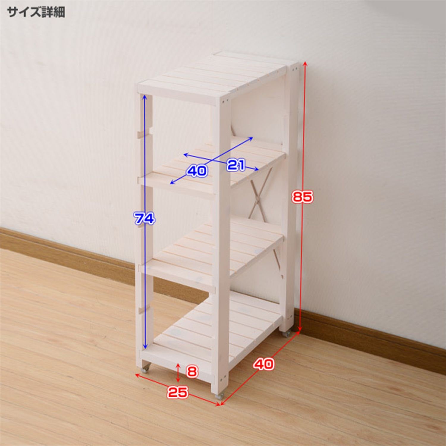 ● Easy loading and unloading with narrow gaps because it is equipped with casters ● Mobile shelf size: Width 21 Length 40 cm ● From the lowest shelf to the uppermost shelf Height: 74 cm ● Height from the floor to the lowest shelf: 8 cm