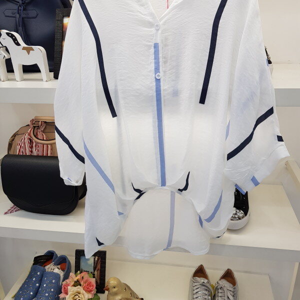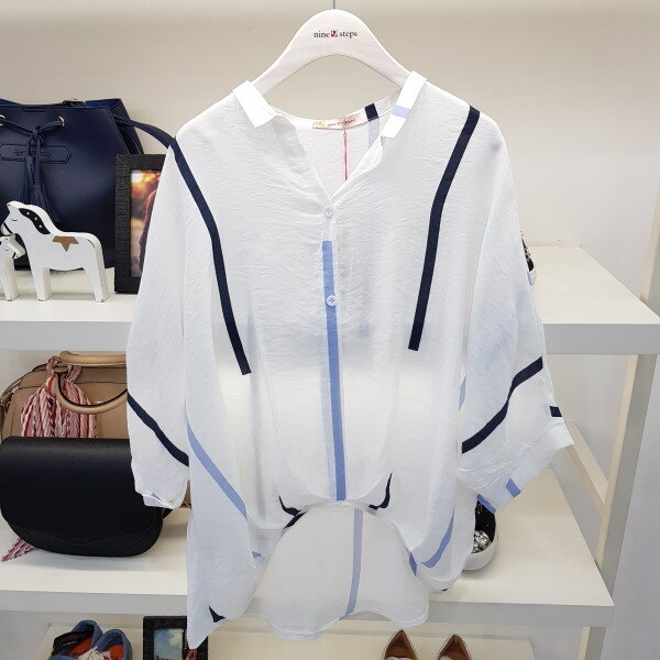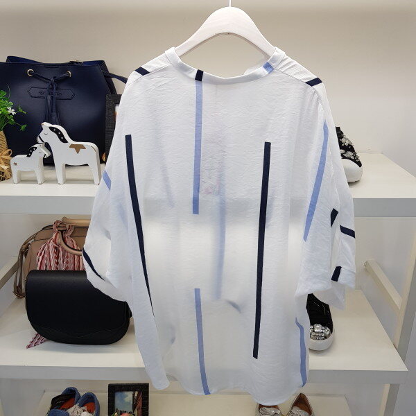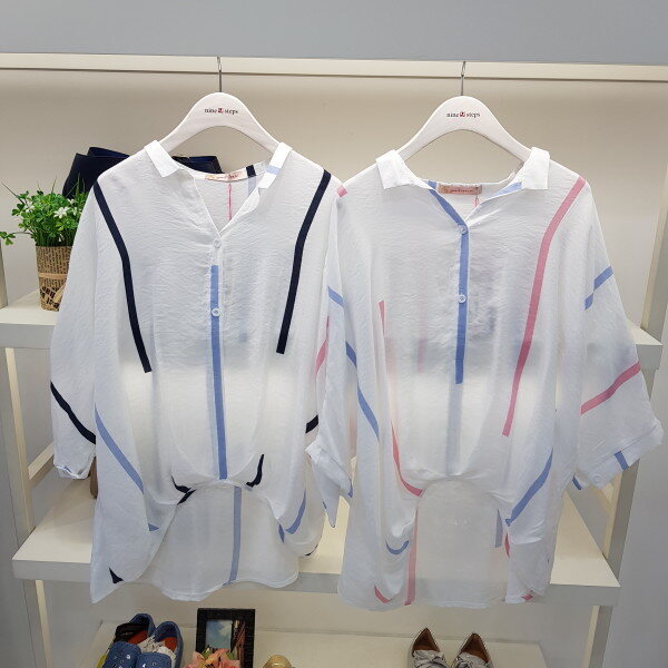 심플 컬러줄 포인트 블라우스촉감이 부드럽고 앞이 짧은 디자인이라 통바지나 슬렉스와 잘 어울리는 블라우스입니다