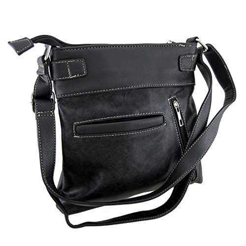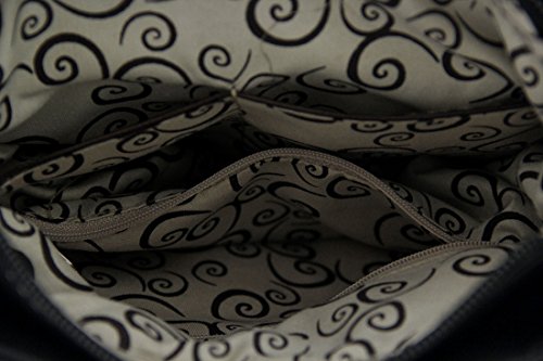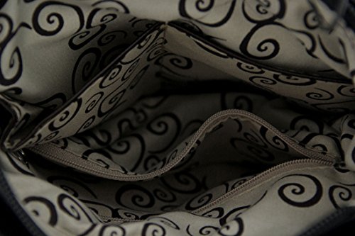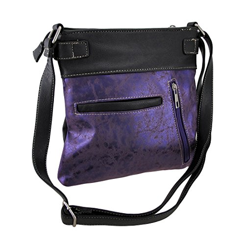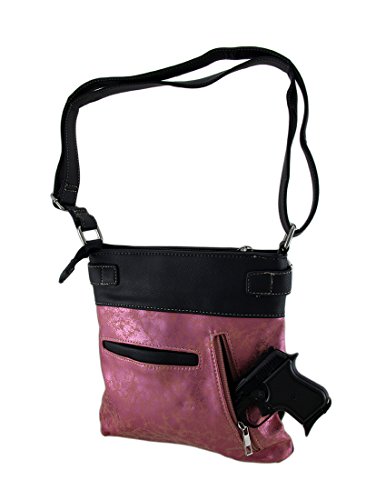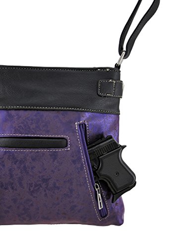 -. Feature : 11 in. High, 9 1/2 in. Long, 1 1/4 in. Wide / Foiled Fabric Construction/Vinyl Trim/Polyester Lined / Rhinestone Covered Skull/Conical Studs and Radiant Rhinestones / Zip Pocket on the Front/Zippered Concealed Carry Compartment and Slip Pocket on Back / 1 Wide Strap /Adjustable 13-24 in. Drop
