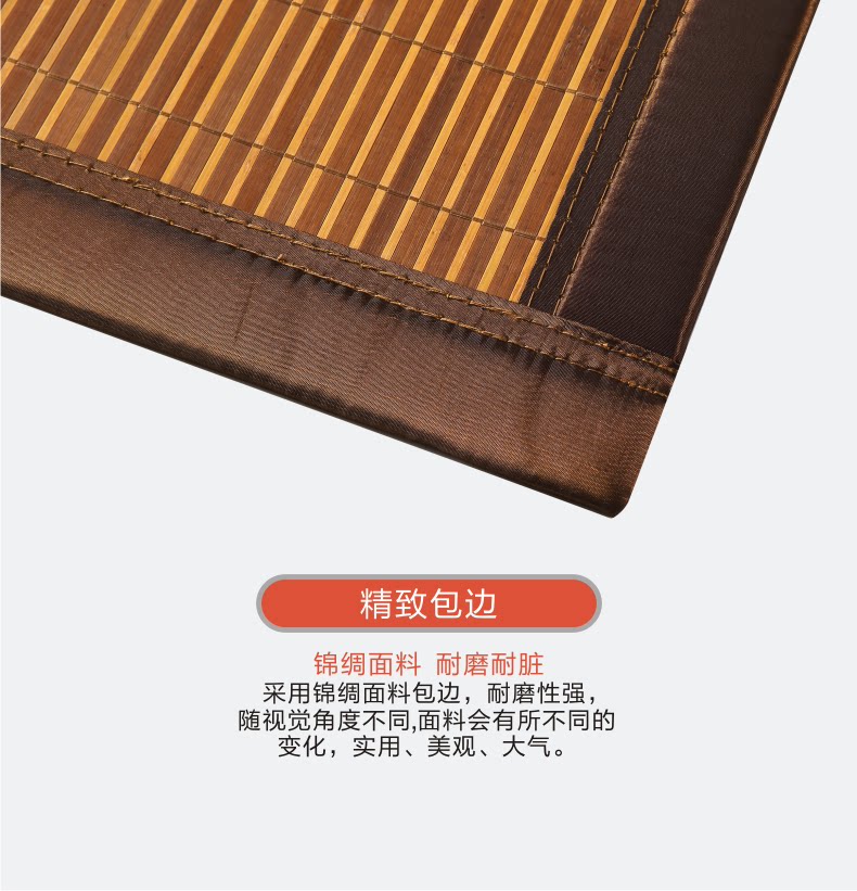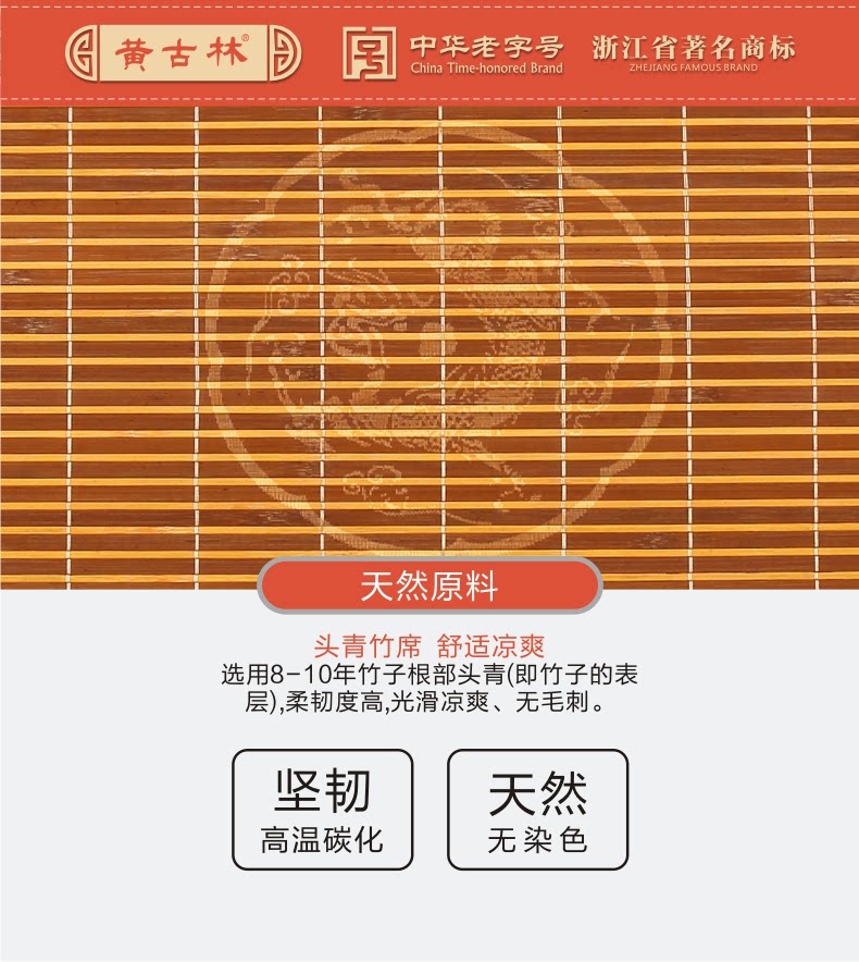 | 产品特点 | 1、选用八年以上老竹的头青,韧性最好,吸汗凉爽,经过200℃-300℃高温高压碳化处理,形成坚硬的碳化微粒,不宜产生细菌,从而达到抗菌作用; 2、不染色,虽然颜色单一,但是是真正意义上的环保竹凉席。 | |