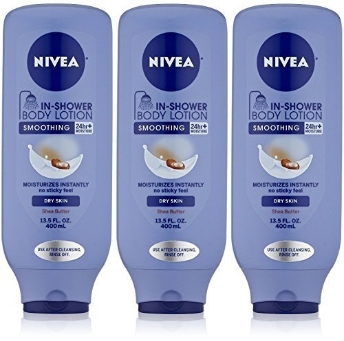 -. Feature : Nivea In-Shower Smoothing Body Lotion / With Shea Butter - For Dry Skin / Moisturizes Instantly - No Sticky Feel - 24 Hours+ Moisture / Net Wt. 13.5 FL OZ (400 mL) Each / Pack of 3 Bottles Per Quantity Ordered