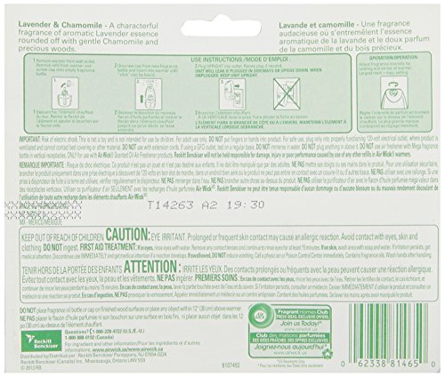 Studio : Air Wick Publisher : Air Wick Binding : Health and Beauty Product Description Air Wick Scented Oils plug in air freshener refills are designed to add a consistent and long-lasting fresh fragrance to any bedroom, bathroom, hallways, kitchens, living rooms, dens or office spaces. This features a characterful fragrance of aromatic Lavender essence rounded off with gentle Chamomile and precious woods. This scented oil plug in air freshener refill is simple to use: just plug in the scented oil warmer into your wall outlet and insert this refill. When the oil runs out, you can choose to replace it with the same fragrance or a different one. 0