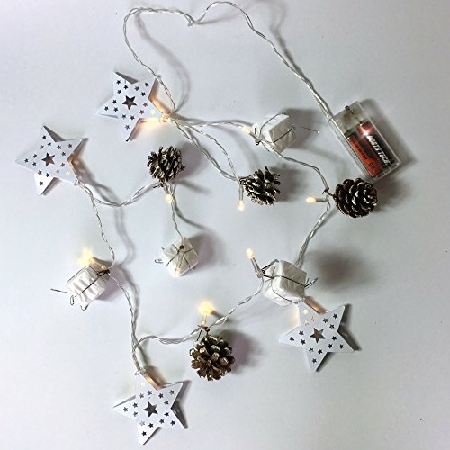Pine Cone Garland - LED Lighted Christmas Garland with Real Pinecones, White Metal Stars and Wrapped Gifts - Holiday String Lights - 200+ Hours of Battery Life
