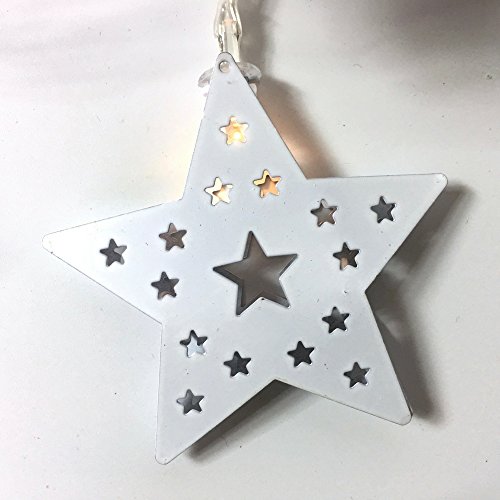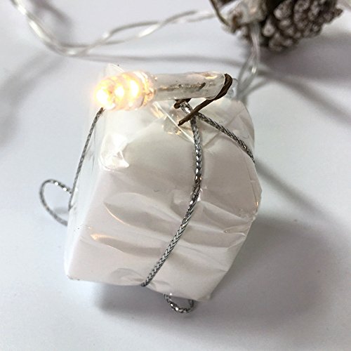 STARS AND SNOWFLAKES. White tin stars and silver wrapped presents adorn this light holiday garland. Use this on any Christmas tree, DIY front door wreath design or up and down your banister. Each strand is battery operated (batteries not included).