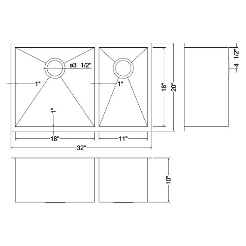Exterior Dimensions: 32" (wide) x 20" (front-to-back) | Interior Dimensions: 18" x 18" (left) x 11" x 18" (right) | Bowl Depth: 10" | Minimum Base Cabinet: 36" wide | Standard 3.5" drain opening will fit any garbage disposal unit