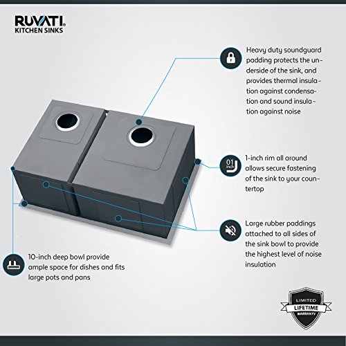 Included in box: Sink, Bottom Rinse Grids (set of 2), Basket Strainer Drain Assembly (qty 2), Cutout Template, Mounting Clips and Installation Guide | Limited Lifetime Warranty - Ruvati USA