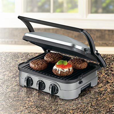 With five separate cooking options, the Cuisinart Griddler can handle everything from pancakes and sausages to grilled cheese to steaks, hamburgers, and panini. A floating cover and one set of reversible plates turn the Griddler into a contact grill, panini press, full grill, full griddle, or half grill/half griddle. Dual temperature controls ensure everything is perfectly cooked every time on the removable dishwasher safe nonstick cooking plates for easy meals and clean up.