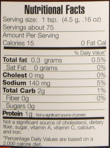 - Made in USA with more than 90% ingredients sourced in USA! 12oz jar = 75 Servings, 15 Calories per cup. (Sodium Content per serving: 140mg)