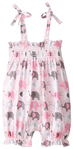 Soft printed bamboo viscose romper has ruffled elastic at neckline and hem with inner leg snap closure. Ties at shoulders. Arrives on padded hanger.