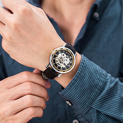 GuTe Mechanical Watch,Unisex Men Women Rose Gold-Tone See-thru Dial Hand Winding Brown Watch (Gold)