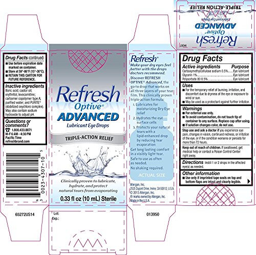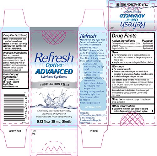 Studio : Refresh Optive Publisher : Refresh Optive Binding : Health and Beauty Product Description The go-to drop that marks a new era in artificial tears. This clinically proven triple action formula: lubricates for moisturizing dry eye relief, hydrates the eye surface cells, protects your natural tears with a lipid-enhanced drop by reducing tear evaporation. Long-lasting comfort Safe to use as often as needed No shaking required Sterile Made in USA 0