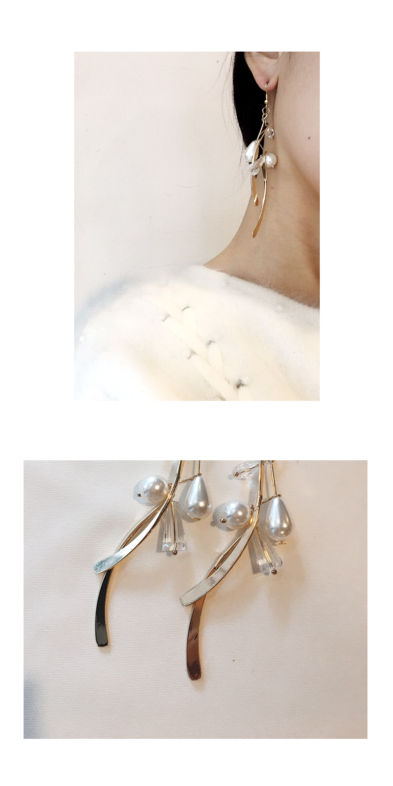 진주, 바 등 다양한 자재로 제작한 볼드한 드롭형 귀걸이입니다. 길이감이 좀 있고 화려한 스타일입니다. :)