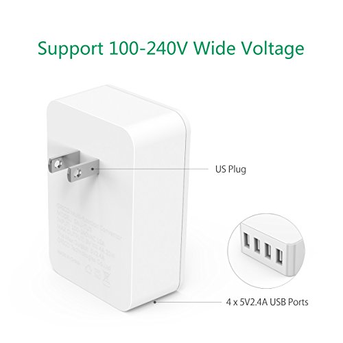 4 port USB charger: 4 x 5V/2.4A super charging ports which can detect and deliver ideal output current each time of up to 2.4A; 4 ports USB charger pumps up to 20W