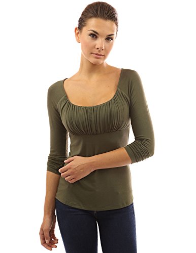 Scoop Neck Ruched Gathered Raglan Long Sleeve Blouse Top. Model in pictures is 5 feet 8 inches (173cm) tall.