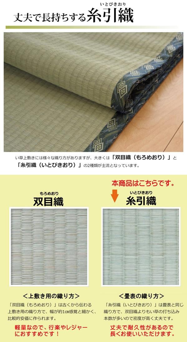 熊本県八代産の減農薬い草を使用。減農薬い草は通常に比べ、耐久性に優れており、上敷きを敷くだけで畳のお部屋をリフレッシュ出来ます。日焼けしてしまった畳のリフレッシュに、新品の畳を汚さないためのカバーにご使用下さい。 |