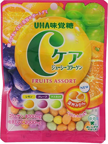 原材料:砂糖、還元麦芽糖水飴、コラーゲン、濃縮果汁(りんご、レモン、グレープ、マスカット、温州みかん)、還元水飴、デキストリン、アサイーエキス、ぶどう種子エキス、乾燥ビール酵母/甘味料(ソルビトール)、ビタミンC、ゲル化剤(アラビアガム)、加工澱粉、酸味料、安定剤(CMC)、光沢剤、香料、着色料(カロチノイド、紫ニンジン、赤ビート、フラボノイド、クチナシ、アントシアニン)、L‐シスチン、(一部にりんご・ゼラチンを含む)