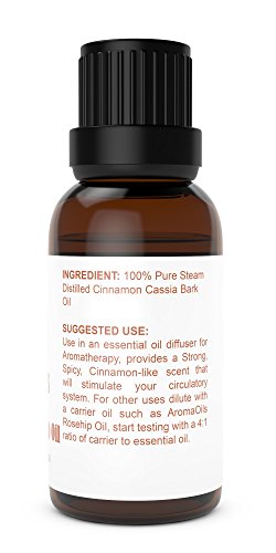 -. Feature : AROMATHERAPY - Our 100% Pure Cassia Bark Oil has been used for many years to provide a Warm and Spicy Aromatic Scent which will help you fight feelings of Exhaustion, Drowsiness, and Fatigue. It's powerful Warming and Stimulant Properties will Improve Respiratory Circulation to aid in Chest Congestion, Chest Colds, and Bronchitis / MUSCLE PAIN RELIEF - Our Cinnamon Oil can easily be blended with a Carrier Oil like our AromaOils Rosehip Oil and can be used as a Massage Oil to relieve achy muscles and sore joints after a long day at work or after a tough exercise routine. It can also be used in a hot bath to have the same effect. Helps with Arthritis and can Relieve Tension Headaches so that you have more energy at home. / ANXIETY and DEPRESSION RELIEF - Our Top Quality Scented Oil has a Tremendous Calming effect on your nervous system and will Provide a Boost to Your Immune System when diffused. This Refreshing Aroma will Ease your Troubling Thoughts and will Help you Overcome These Sometimes Crippling Issues. / PREMIUM QUALITY - Our Cinnamon Cassia Essential Oil is Therapeutic Grade and Steam Distilled from the twigs and bark of the finest Indonesian Cassia Evergreen Trees that we could find. This is NOT a Diluteded Oil and contains no additives, fillers, bases, carrier oils, alcohols, or anything extra to ensure that you receive every last benefit that the Cassia Tree has to offer. / SATISFACTION GUARANTEE - We offer a money back satisfaction guarantee should you not be satisfied with your purchase, simply contact the company and we will take care of you!