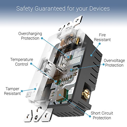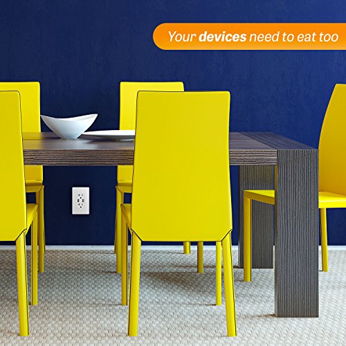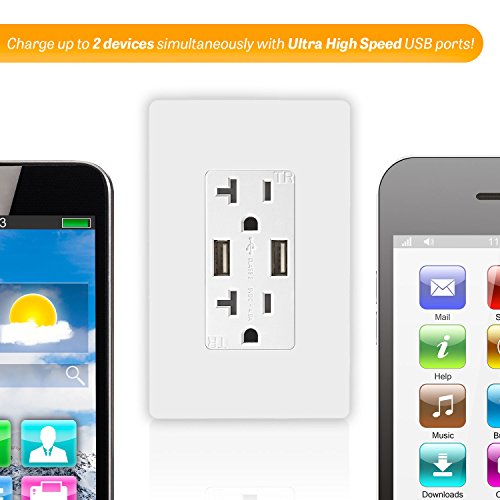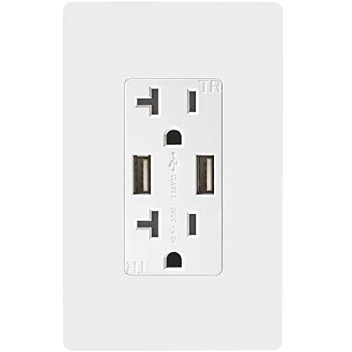 - 4.0 Amp USB outlet with 20A duplex receptacle, charges two USB devices simultaneously without adapters at high speed