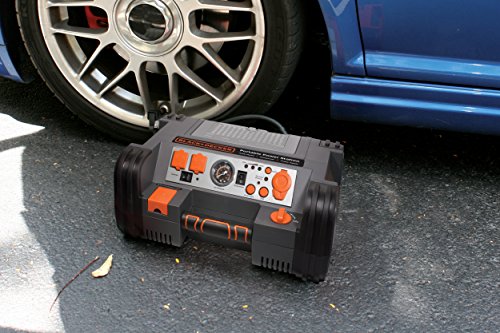 The Black & Decker Professional Power Station combines a portable household power supply with a jump starter and 120 PSI compressor. The 500 watts power inverter with two electrical household outlets, 12 volts outlet and a USB port provides power for a small TV to watch the pre-game show and electric grill to cook breakfast while camping. Head to the beach and power a radio for up to 10 hours. Charge cell phones, MP3 players and laptops from just about anywhere. The Black & Decker Professional Power Station comes as a 450 amperes instant jump starter. The Black & Decker Professional Power Station includes powerful 120 PSI compressor to quickly inflate vehicle tires. Due its portability, it goes anywhere to inflate bike tires, sports ball, air rafts and more. If power fails at home, the Black & Decker Professional Power Station powers lights, small TV, radio and more. There are no fumes as with gas-powered generators. The Black & Decker Professional Power Station includes a high-powered LED light that will shine up to 15 hours. The Black & Decker Professional Power Station can be recharged from a household outlet. Product is tested by independent testing labs for safety and reliability, including ETL.Feature