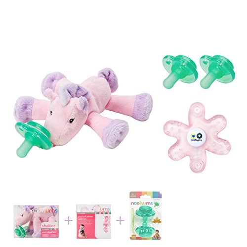 -. Binding : Baby Product -. Brand : Nookums -. Color : Brown -. EAN : 0895471002758 -. Feature : Stop Lost Pacifiers - Paci-Plushies make finding baby's pacifier a snap! Eliminate the stress of searching for lost pacifiers. / Easily Replace Pacifiers - Each Paci-Plushie Plush Toy Pacifier Holder includes a pacifier that detaches from the animal for easy replacement & sanitation. Use our Nookums pacifier or swap it out for your own. Paci-Plushies Pacifier Holders have a flexible Hug Ring that attaches to a variety of baby's favorite pacifiers including Mam, Avent, NUK and more. Please Note: Paci-Plushies are compatible with most but not all pacifiers. Paci-Plushies work best with pacifiers with button shields / Helps with Fine Motor Skills - Paci-Plushies plush animals make it easier for babies to independently maneuver the pacifier at a younger age. Our hable designs are sized for little hands and textured for touch and exploration. / Grows with Baby - Turn any Paci-Plushies Pacifier Holder into a Teether with our Chillies Teether Add-On. Chillies Teethers are filled with purified water and store in the fridge. These lightweight chillables help to soothe tender gums and boo-boos for children of all ages. Attach your favorite Paci-Plushie and baby will enjoy the cool teether while keeping their fingers warm with their favorite plush. (Teether Included in Gift Set) / Helps with Transition - When baby outgrows the pacifier, the Paci-Plushies animal becomes a familiar toy that helps ease the transition tear-free. Pacifier detaches for replacement & sanitation. Plush is machine washable. -. Label : Nookums LLC -. Manufacturer : Nookums LLC -. MPN : 895471002758 -. PartNumber : 895471002758 -. ProductGroup : Baby Product -. ProductTypeName : BABY_PRODUCT -. Publisher : Nookums LLC -. Studio : Nookums LLC -. Title : Nookums Paci-Plushies Unicorn Shakies Baby Gift Set - Includes Plush Toy Pacifier Holder with Rattle, Teether and Replacement Pacifier 2 Pack (Plush Toy Includes Detachable Pacifier) -. UPC : 895471002758