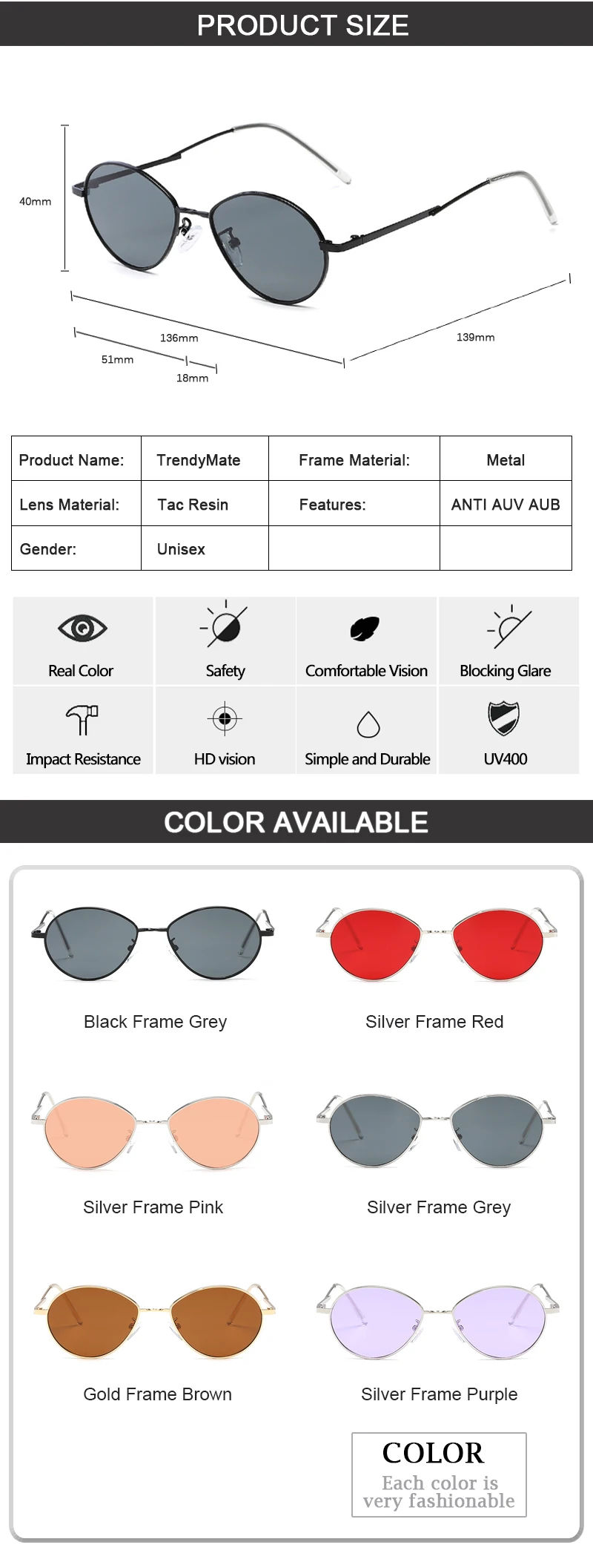 Sunglasses Function:UV400 Protection Against Harmful UVA/UVB RAYS
