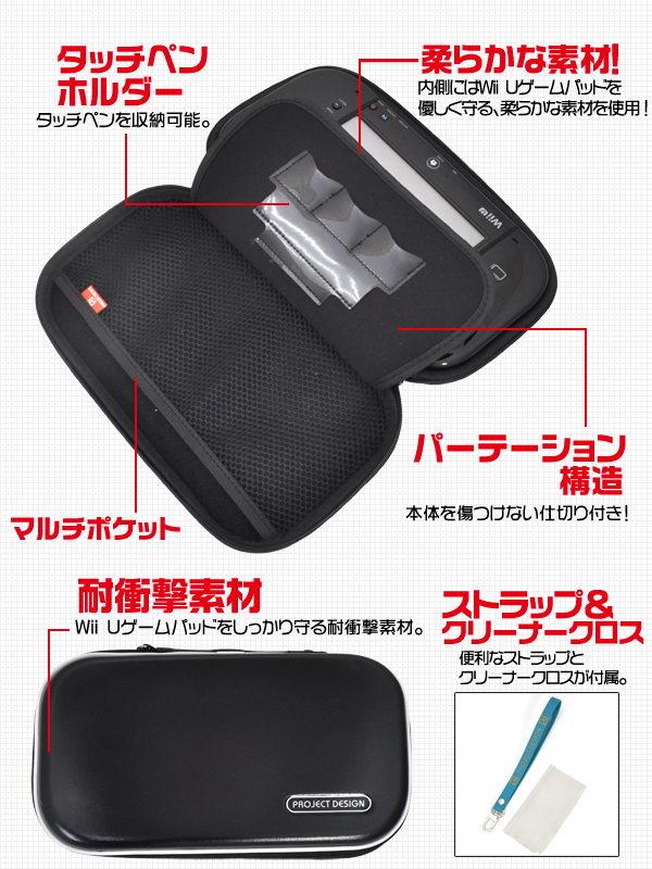 持ち運びや収納にオススメ!衝撃に強いWii Uゲームパッド用ハードポーチ。 Wii Uゲームパッド本体にピッタリサイズ!キズや汚れから、しっかり本体を守ってくれます。 外側には衝撃に強い耐衝撃素材を採用!外部からの衝撃から保護します。 また内側には柔らかな素材を採用し、Wii Uゲームパッド本体を優しく守ります。 ポケット付きで、タッチペンも本体と一緒に収納できます。 本体を傷つけないようにパーテーション付き!ベルト通し付きなので、ベルトにも装着可能です。 便利なストラップ付き!クリーナークロスも付いています。 ※ライセンス商品ではありません ※WiiUゲームパッドは付属しません。 | |