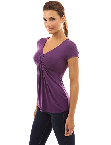 PattyBoutik V Neck Twist Knot Front Short Sleeve Casual Stretch Blouse Top. Model in pictures is 5 feet 8 inches (173cm) tall wearing size S.