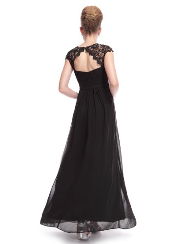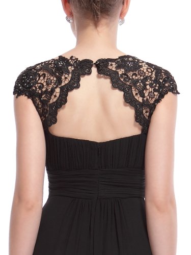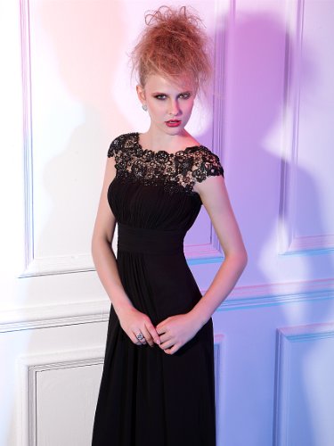 Elegant black chiffon evening dress with lacey cap sleeves. Perfect for your next formal occasion whether it be an evening party or even your turn as the mother of the bride or groom. Delicate lace and rhinestones decorate the neckline while the ruching in the bust and waist creates a figure flattering silhouetteFeature