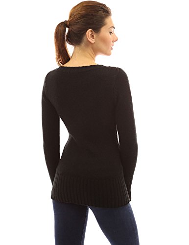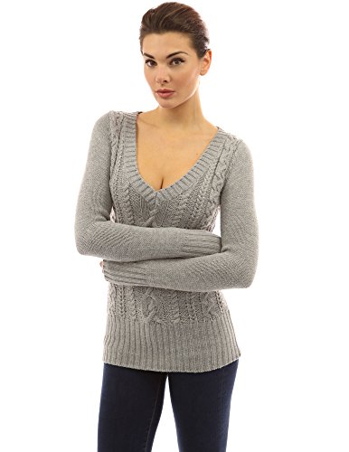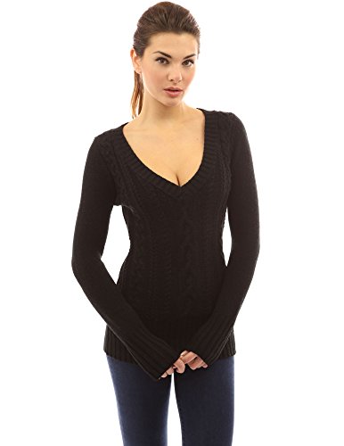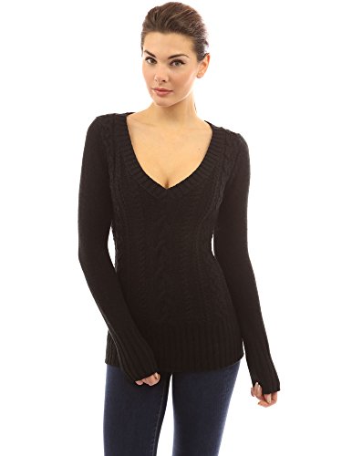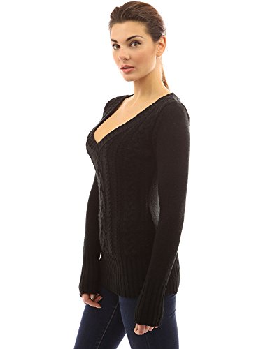 PattyBoutik Deep V Neck Long Sleeve Cable Knit Sweater. Model in pictures is 5 feet 8 inches (173cm) tall wearing size S.
