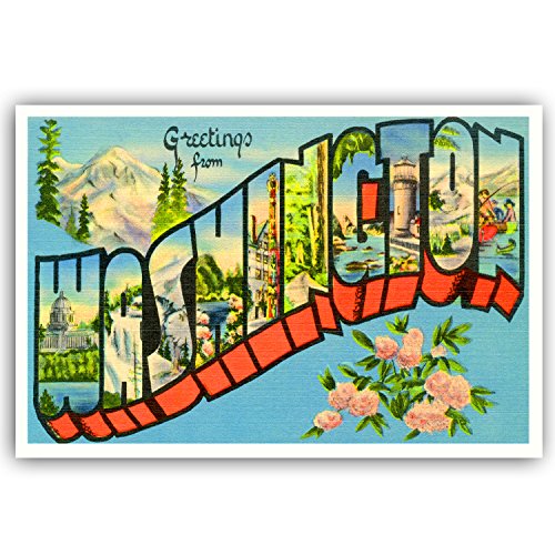 GREETINGS FROM WASHINGTON vintage reprint postcard set of 20 identical postcards. Large letter US state name post card pack (ca. 1930's-1940's). Made in USA.