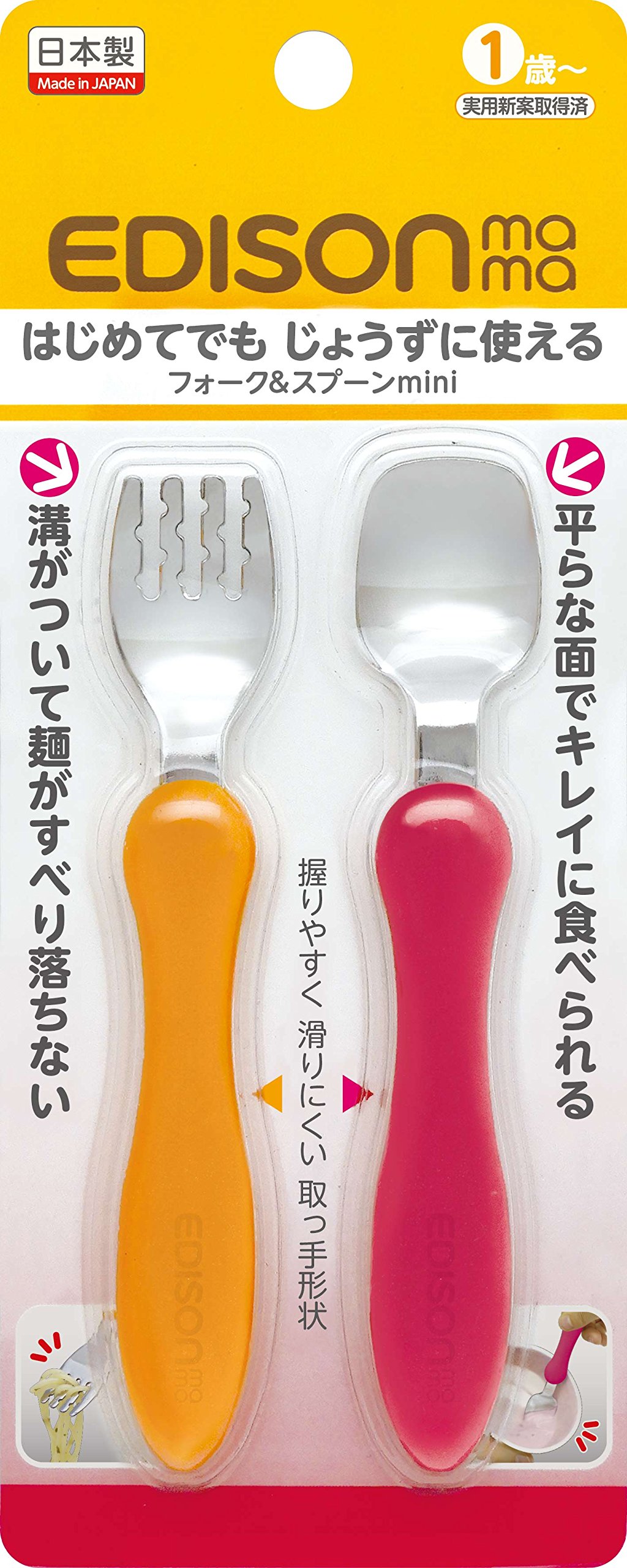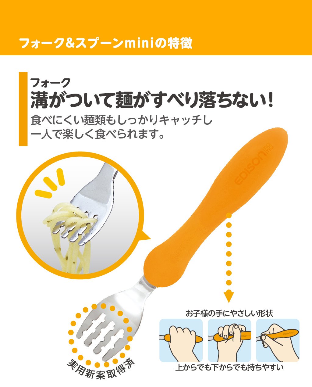Fork: Noises do not slide down with grooves! Also catch noodles which are hard to eat and you can eat alone fun.