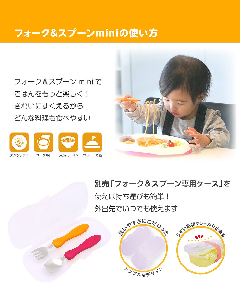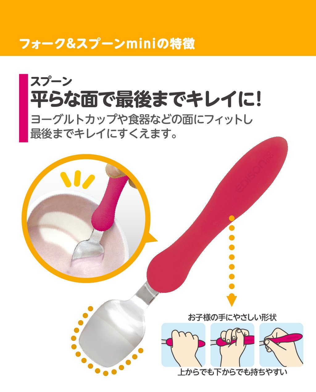 Spoon: You can eat cleanly on a flat surface! It fits to the face of yoghurt cup and tableware and it cleanses beautifully to the last.