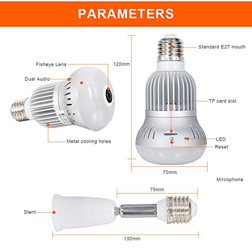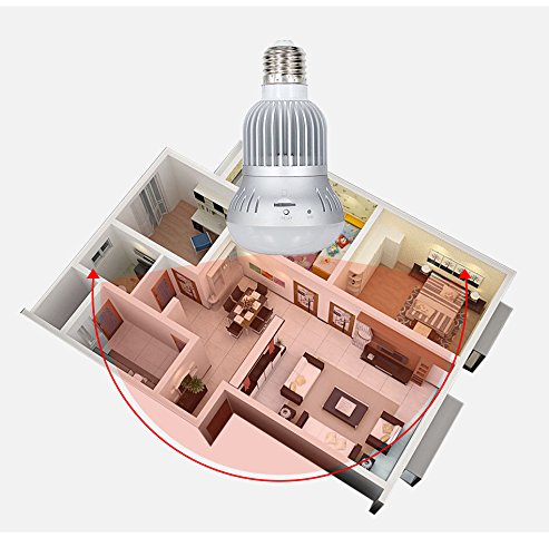 -. Feature : SUPER WIDE ANGLE: 1 pcs 360°panoramic cam,1/3'' Fisheye Lens brings the coolest experience of using. Never worry about a blind area. HD 1.3MP camera can transfer 1280*960P video. / MOTION DETECTION: Push notification of motion detection alert to your mobile in real time when bulb detected movement. Professional and faithful Jiusion light bulb is your best protective guide. / APP CONTROL WAKE UP: Light up the bulb with 1-click. This smart bulb is the intimate partner in your daily life. You can enjoy the intelligent life right now with this smart bulb. / WIFI&IP CAMERA: App-enabled surveillance camera bulb can let you watch your home in a long distance. You can use your smartphone or iPad to be the monitoring devices. It can be used in warehouse, home, office or other places. / TWO-WAY COMMUNICATION: Built-in microphone and speaker, this spy camera light bulb can hear you no matter where are you and detect the invader then let you know. Hear and speak in both side, perfect as an intercom, you can enjoy real-time live feed now by using this smart dome bulb camera.