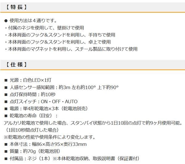 | 暗くなると、自動でスタンバイ。暗い場所で人を感知して自動点灯、離れると自動で消灯します。電源・配線不要の乾電池式なので、コンセントの無い場所でも簡単に設置出来ます。設定ボタンも1ヶ所だけのシンプル設計です。 |