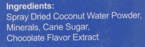 Ingredients: spray dried coconut water powder, minerals, cane sugar and chocolate flavor extract