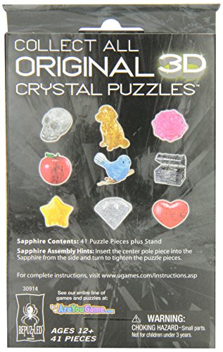 -. Binding : Toy -. Brand : Bepuzzled -. EAN : 0522825332864 -. Feature : The 3D Crystal Puzzle Sapphire from BePuzzled is a sleek, translucent puzzle with 41 unique interlocking pieces / Take puzzling to a whole new dimension with this unusual crystal puzzle / Enjoyable to work on, challenging to complete, fun to display / This 3D puzzle has a difficulty level of 1 and is fun for puzzlers age 12 and up / Approximate assembled size = 2-3/4" x 2-3/4" x 2" (without stand) -. IsAdultProduct : 0 -. ItemPartNumber : 30914 -. Label : University Games -. Manufacturer : University Games -. Model : 30914 -. MPN : 30914 -. PackageQuantity : 1 -. PartNumber : 30914 -. ProductGroup : Toy -. ProductTypeName : TOYS_AND_GAMES -. Publisher : University Games -. Studio : University Games -. Title : Original 3D Crystal Puzzle - Sapphire -. UPC : 023332309146 -. Warranty : No Warranty