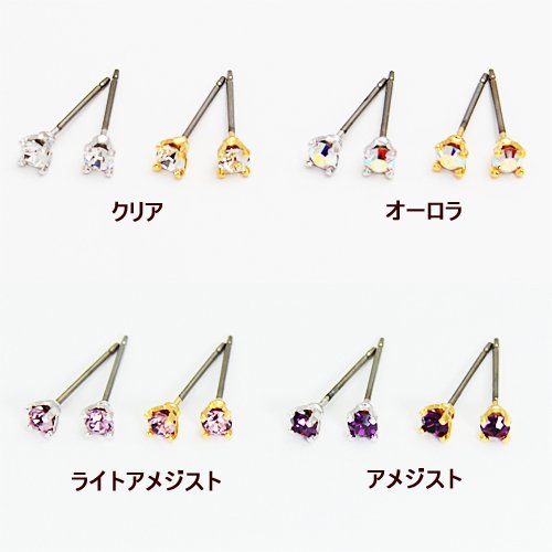 針の太さ:直径約0.7mm / 金具カラー:ゴールド・シルバー / ストーンカラー:クリア(クリスタル)、オーロラ(レインボー)、ブラック(ジェット)、ブラックダイヤ(グレー)、 レッド(ライトシャム)、ワインレッド(シャム)、ローズ(ピンク)、ライトローズ(薄ピンク)、サファイヤ(ブルー)、 アメジスト(パープル)、ライトアメジスト(薄紫)、アクア(水色)、ターコイズ(トルコ)、エメラルド(グリーン)、 ライム(ペリドット)、ピーチ(シャンパン)