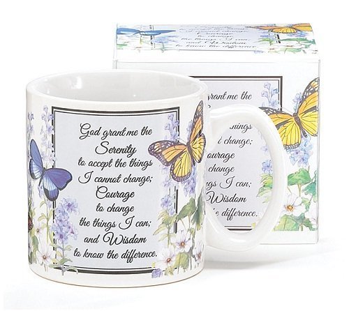 Mug accented with Blithe Butterflies and Serenity Prayer: God Grant me the serenity to accept the things I cannot change: courage to change the things I can and wisdom to know the difference.